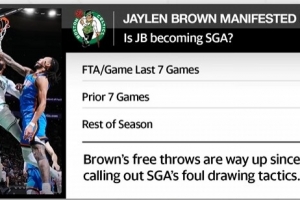 据统计,布朗从吐槽亚历山大罚球起的7场比赛,场均11.6次罚球,而在这之前的7场场均8.4罚,赛季场均6.9罚。