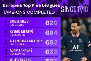 体育资讯4月1日讯 Squawka列出了17-18赛季以来五大联赛成功过人排名,梅西826次居首,姆巴佩684次第二。