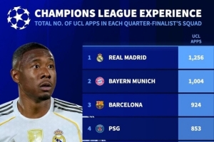 体育资讯4月15日讯 欧冠八强战将战火重燃,《转会市场》也列出了当前各队阵容中的总欧冠出场次数情况,皇马、拜仁、巴萨列前三。