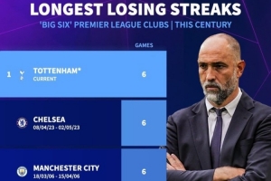 据德转数据统计,6连败是本世纪英超Big6球队遭遇的最长连败,如果在当地时间本周日的联赛中不敌利物浦,热刺将成为本世纪Big6球队中连败场次最多的球队。