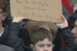 比赛现场看台有一位可爱的小球迷高举纸牌,上面写道:“对不起妈妈,但是今天是我第一次来到现场看曼联比赛,祝您母亲节快乐!”